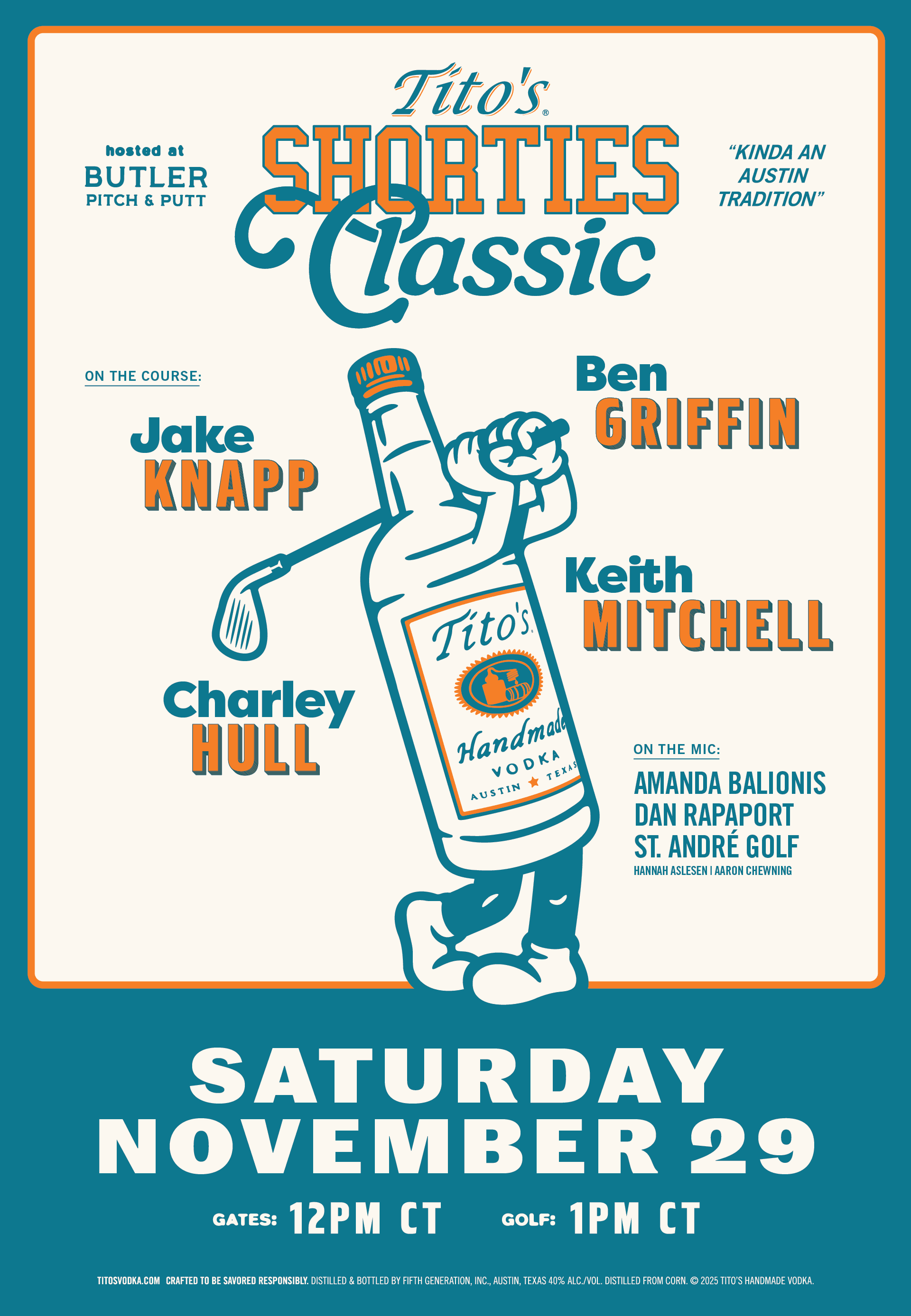 If you live in the Austin area, come hang! The Tito’s Shorties Classic will be open to the public 21+, and tickets are available for purchase, here. If you can’t make it, no worries. There will be a filmed version of the event slated for a January release.