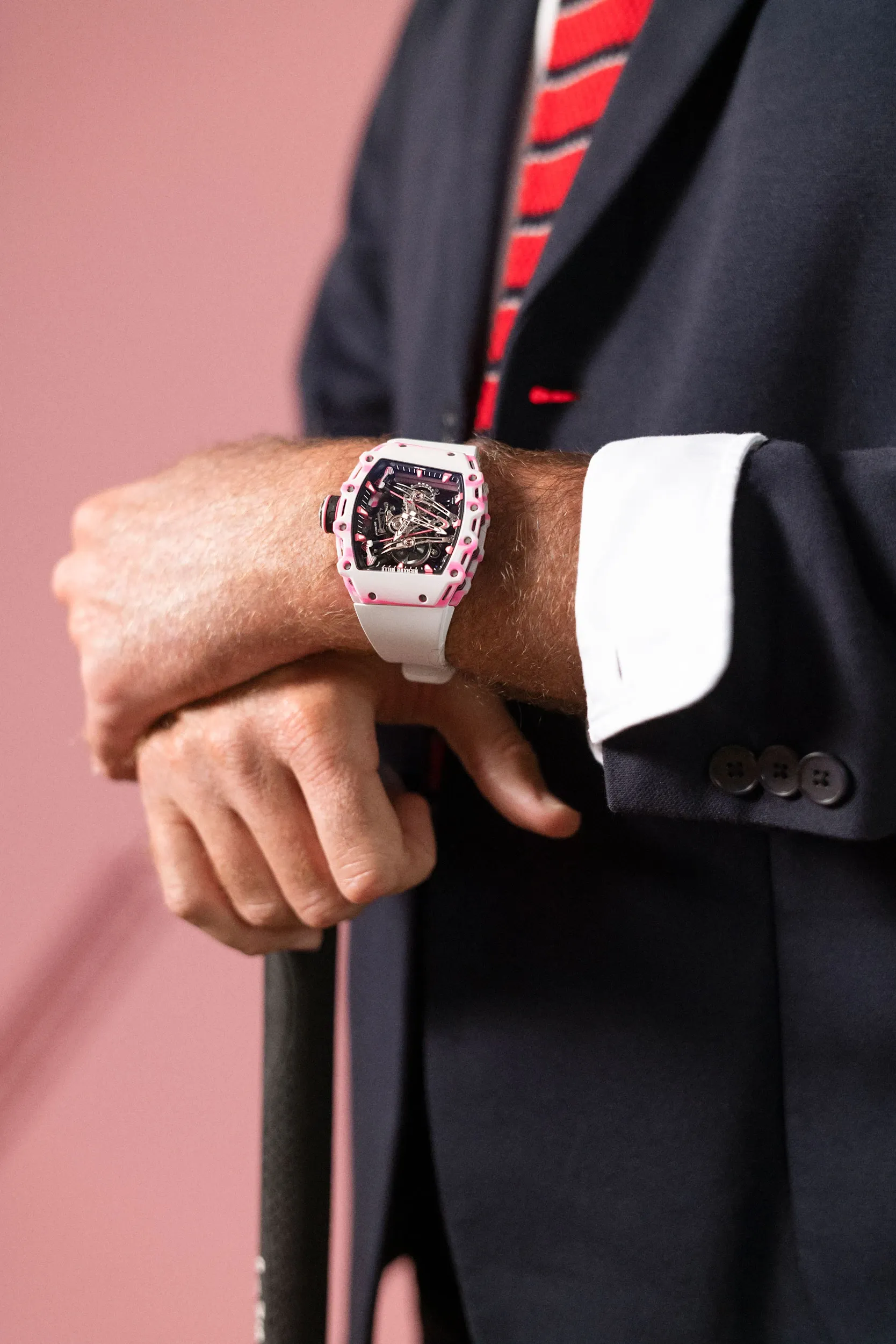 A $2.5 million Richard Mille built from Carbon TPT with a skeletonized tourbillon movement and signature pink accents, designed with Bubba Watson